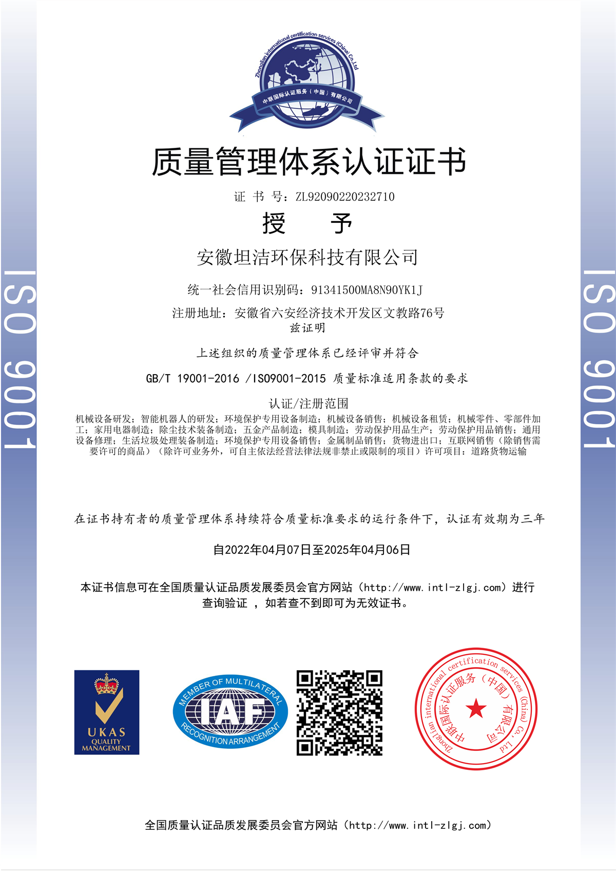 三明质量管理体系认证证书